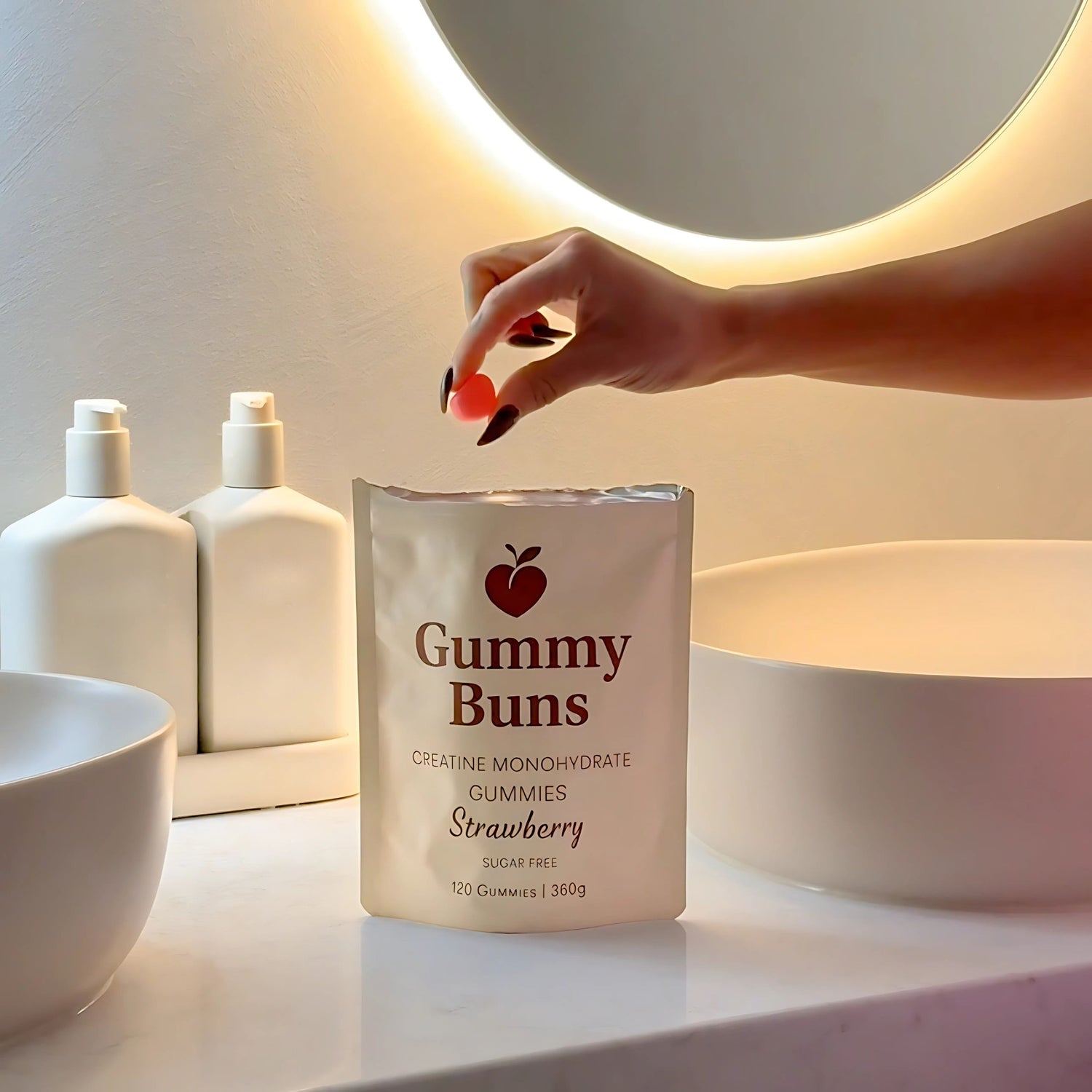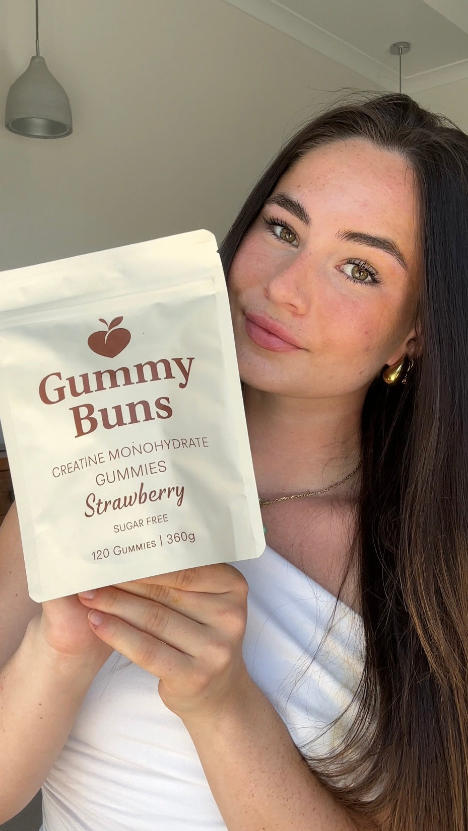 Gummy Buns contain creatine monohydrate to boost strength and support muscle growth, L-Taurine for recovery and endurance, and vitamin B12 for energy and metabolism. They're made with natural fruit flavour, pectin, and gentle acids to keep them tasty and effective—perfect for sculpting glutes and staying energised.